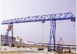 門式起重機是橋式起重機的一種變形,又叫龍門吊。主要用于室外的貨場、料場貨、散貨的裝卸作業。它的金屬結構像門形框架,承載主梁下安裝兩條支腳,可以直接在地面的軌道上行走,主梁兩端可以具有外伸懸臂梁。門式起重機具有場地利用率高、作業范圍大、適應面廣、通用性強等特點,在港口貨場得到廣泛使用。