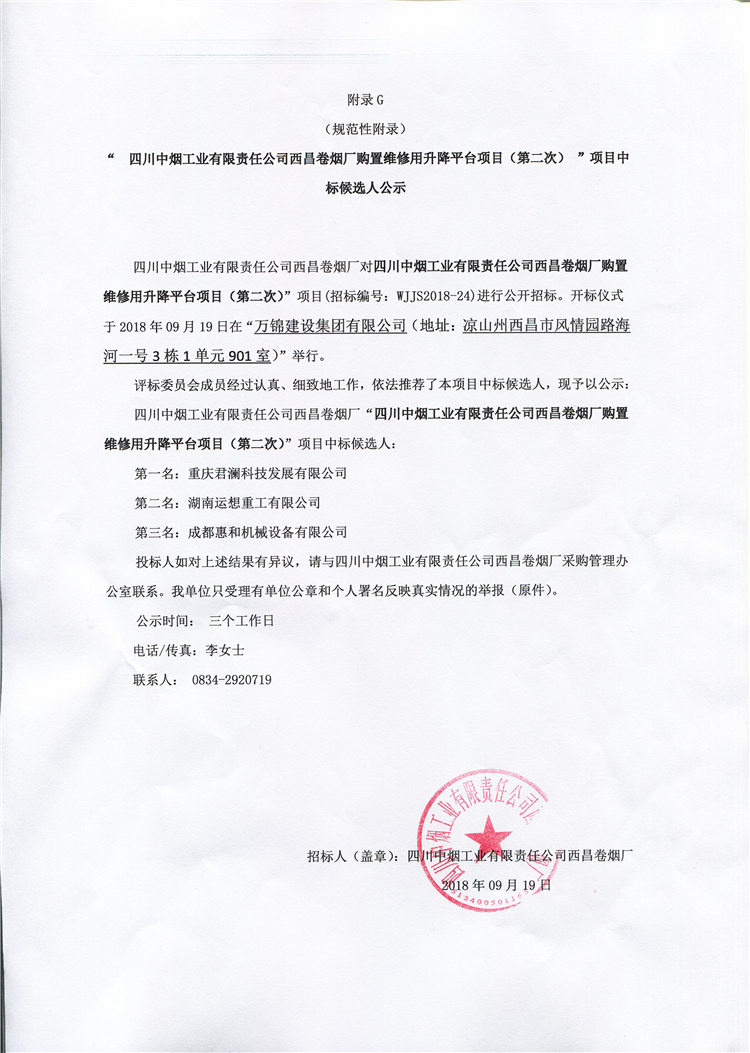 四川中煙工業(yè)有限責(zé)任公司西昌卷煙廠“四川中煙工業(yè)有限責(zé)任公司西昌卷煙廠購(gòu)置維修用升降平臺(tái)項(xiàng)目(第二次)”項(xiàng)目中標(biāo)候選人: