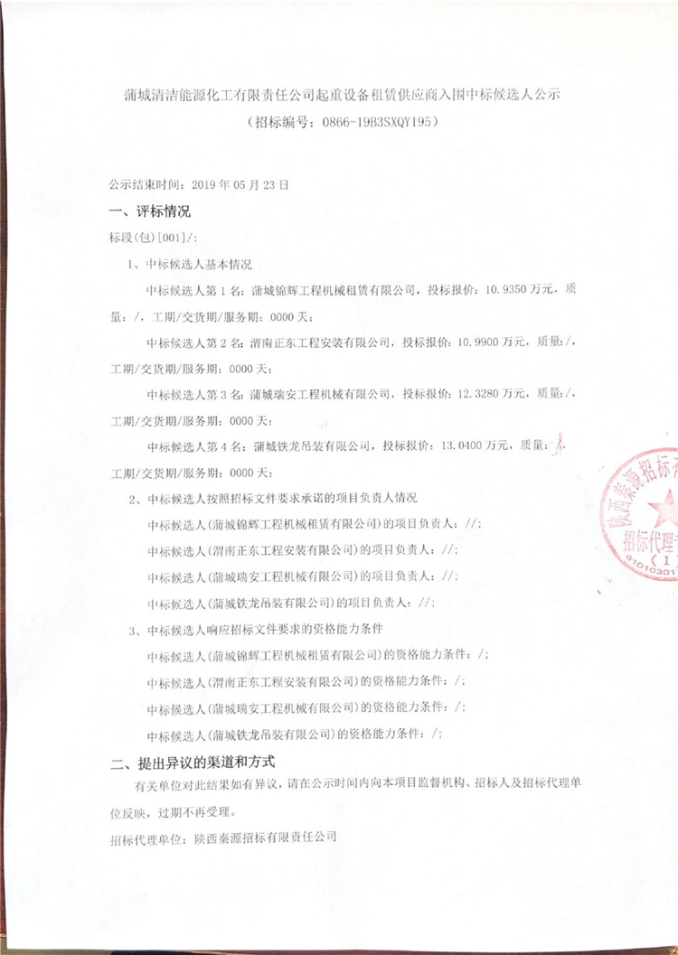 蒲城清潔能源化工有限責任公司起重設備租賃供應商入圍中標候選人公示