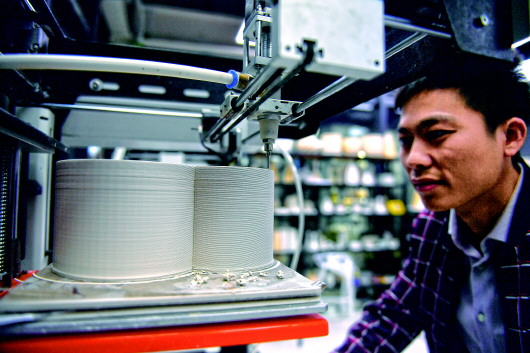 在江西景德鎮(zhèn)陶溪川文創(chuàng)街區(qū)的陶瓷3D打印體驗中心,3D打印陶瓷成為現(xiàn)實(資料圖)。新華社記者胡晨歡攝