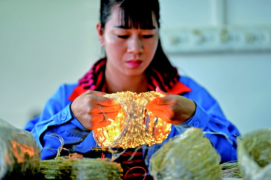 在江西省上猶縣光電科技產(chǎn)業(yè)園的扶貧車間內(nèi),質(zhì)檢員在檢測LED產(chǎn)品(資料圖)。新華社記者李鑫攝