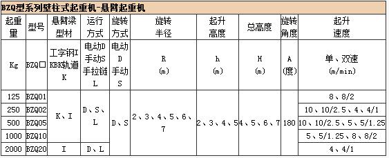 BXD型旋臂起重機是與PK型環鏈電動葫蘆或CD型電動葫蘆配套使用的一種起重設備。具有操作簡便、運行可靠、維修方便等特點。廣泛適用于車間機床的上、下物料和工序間、生產線的工件吊運等場合。旋臂起重機在作業時,用手推動懸空的重物或拉環,實現起吊物體的移動。墻壁式旋臂吊其**優點**是可以直接安裝在墻面或立柱上,或者也可以安裝在機器設備上,從而不需要占用任何地面空間,安裝方式簡便。如果作業場合壁柱可以利用,且吊運工作半徑靠近壁柱,用戶選用墻壁式旋臂起重機較為經濟實惠。用戶可在0.25—2噸的范圍內選擇產品的起重量。